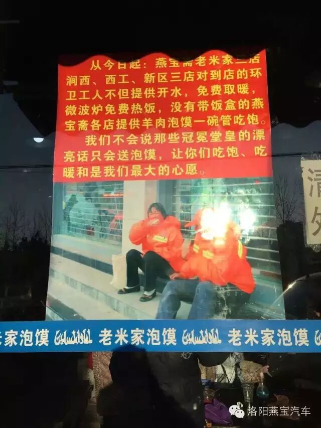 自今日起,洛阳燕宝斋老米家饭店 (涧西、西工、新区三家分店)对环卫工人提供免费开水、取暖 、微波炉热饭。没有带饭盒的环卫工人进店,燕宝斋老米家各店将免费送羊肉泡馍一碗,管饱吃 。另:燕宝旗下各汽车销售店营业时间内均有开水向环卫工人免费供应,也可進店取暖歇息【此信息真实有效,劳朋友们转发。】