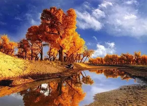 新疆的秋天如同上帝打翻的调色板,五彩斑斓,这时的西北第一村白哈巴的5号界碑美极了,可可托海的红树沟在9月25号左右是黄透红透交替的季节,还有白沙湖,在这个季节里如同一副油画。