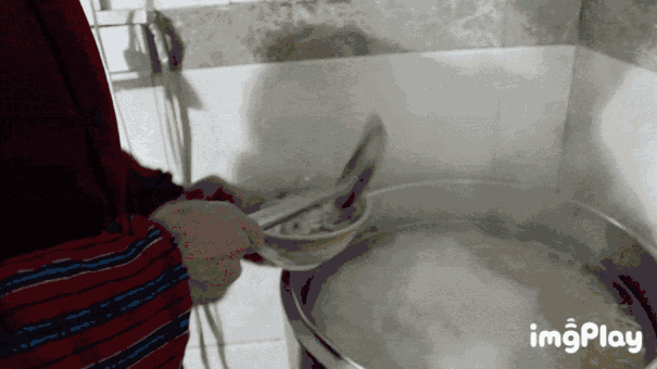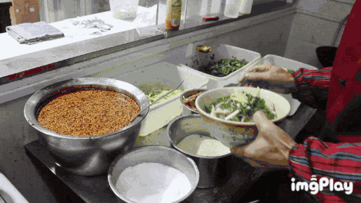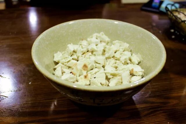 制作葫芦头的过程,也是十分好玩的,先将馍掰成指甲盖大小,不像羊肉泡馍掰的那么讲究,葫芦头的馍可以稍微大一些。