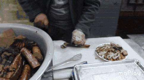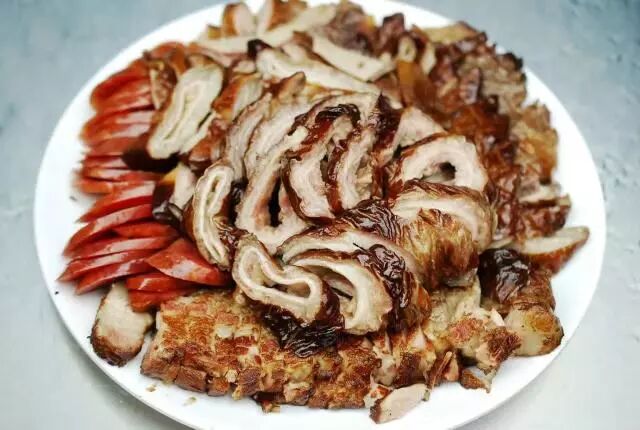梆梆肉是由猪肉、内脏熏制而成的一种肉食品。揭开盖子,那迷幻的一股味就冒出来了,色泽看着很浓厚,由老板亲自拿出来,均匀的切至盘中。