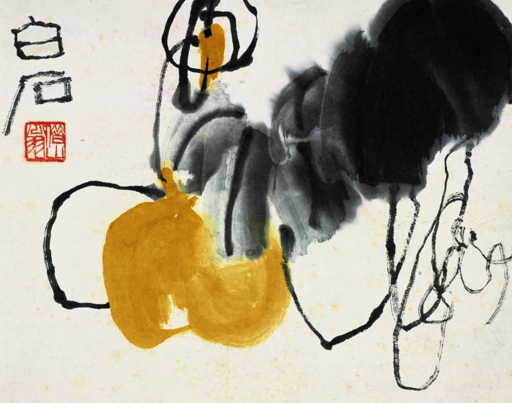 葫芦画虽然只是齐白石花卉蔬果中的一个小小分支,但小中见大,从其不同题材、不同时期、不同技法的葫芦画中,可以窥测其花卉画演变的痕迹,以及其一贯坚持的艺术理念和创作态度。正如有学者指出的,齐白石这种“带有泥土味的形象不是简单的写生和记录,只是一种文化的记忆,是传达文化的一个媒介”这对于我们从不同侧面了解齐白石艺术全貌,无疑是具有裨益的。这或许便是探讨齐白石葫芦绘画的意义所在。