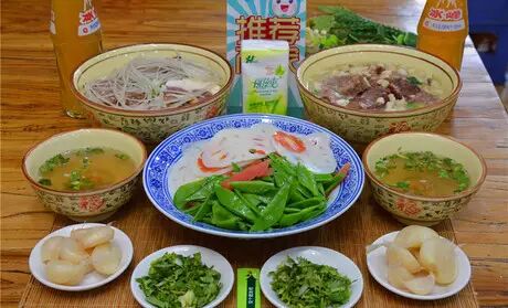 牛羊肉泡馍原名羊肉泡馍,古称"羊羹",宋代著名诗人苏轼有"陇馔有熊腊,秦烹唯羊羹"的诗句。羊肉泡馍的烹饪技术要求很严,煮肉的工艺也特别讲究。其制作方法是:先将优质的羊肉洗切干净,煮时加葱、姜、花椒、八角、茴香、桂皮等佐料煮烂,汤汁备用。馍,是一种白面烤饼,烤饼的面必须是死面,吃时将其掰碎成黄豆般大小放入碗内,然后叫厨师在碗里放一定量的熟肉、原汤,并配以葱末、香菜、黄花菜、黑木耳、料酒、粉丝、盐、味精等调料,单勺制作而成。