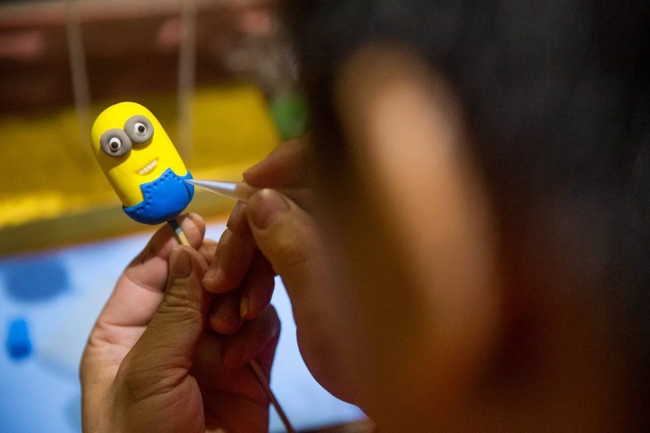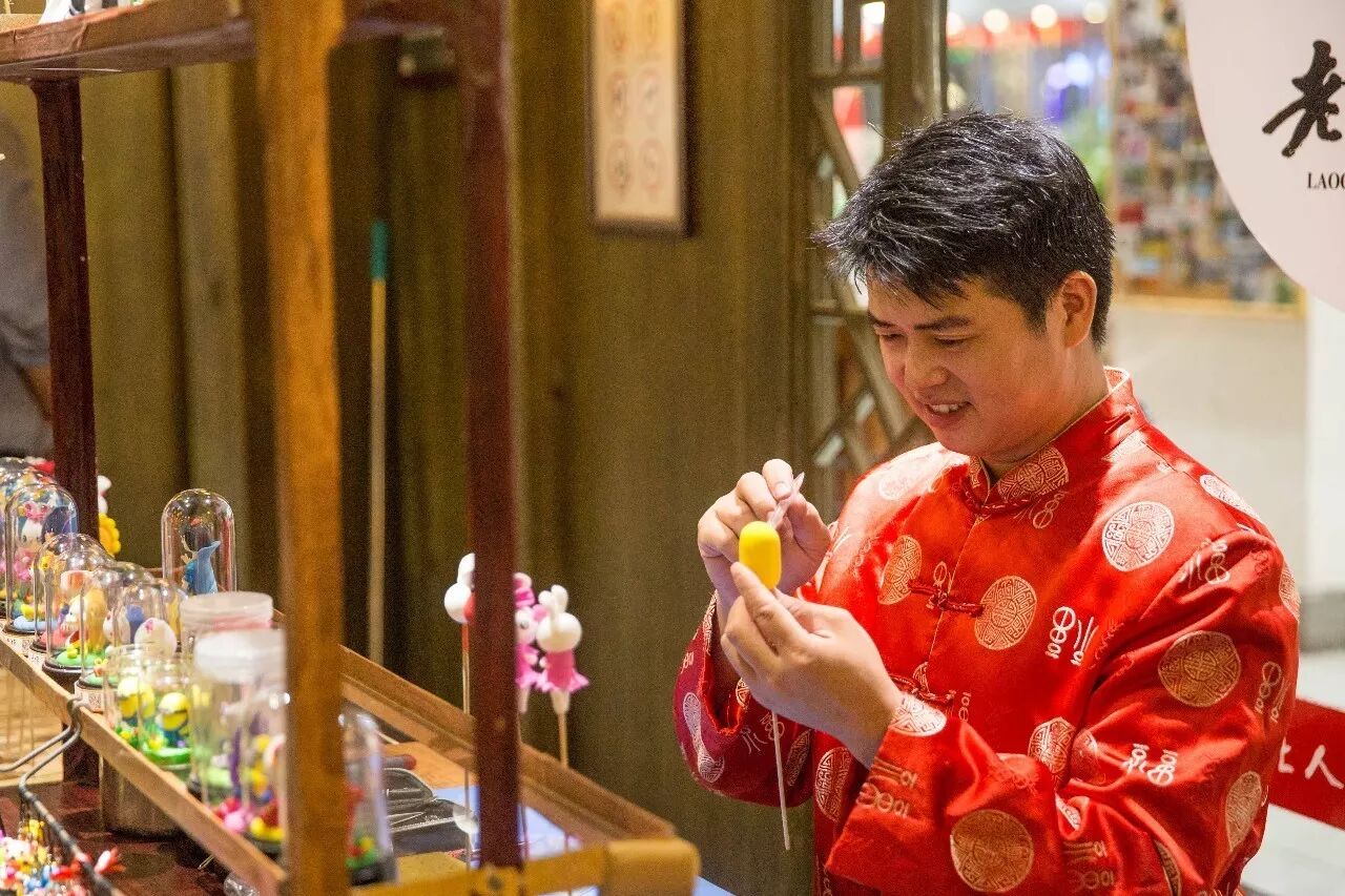 喧嚣的人群里,王虎专注地捏着面人。来到他跟前,他将一根竹签捏在手里,红、黄、蓝、白各色面团在他的十指中揉、搓、挤、压、团、挑、按、拨、拍的连连动作之下,几分钟的功夫,一个惟妙惟肖的卡通人物“小黄人”便赫然而出。