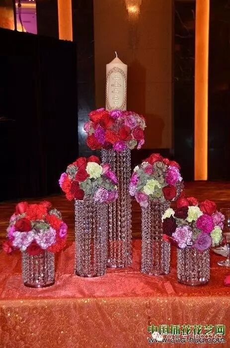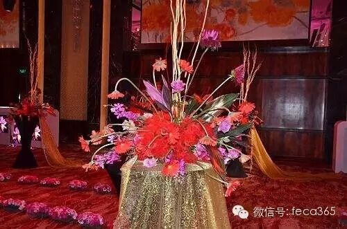 今天,小编给大家分享的是杉本薫子“爱与魅惑”并存的“香格里拉”婚礼,花材主要用了表现奔放热烈、激情妖艳的红色系列。但是,单纯的红色容易让整体设计显的平坦、幼稚。因此,在配色上以红色为中心使用了红紫、茶色等浓烈的花材来加深其层次感,并添加金银色和水晶等有光泽的装饰,营造一种豪华感。