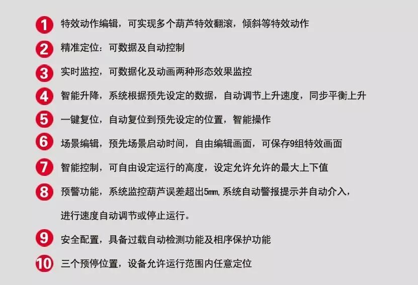 葫芦吊杆行程一般距离栅顶下0.5米到舞台面1.5米左右。此系统利于可靠的工业控制技术,采用进口PLC控制,,系统自动采集葫芦运行数据,,将运行数据通过动画及数字两种形态同时显示在界面上,并可在不同的场景中设置不同的效果,最多可保存9组场景运行数据.该系统可用于吊杆控制,也可以用于常规演绎工程架的升降控制。