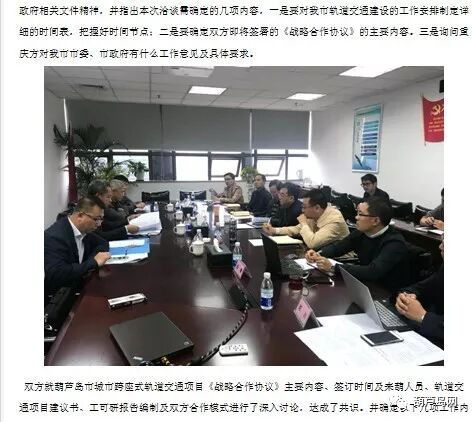 双方就葫芦岛市城市跨座式轨道交通项目《战略合作协议》主要内容、签订时间及来葫人员、轨道交通项目建议书、工可研报告编制及双方合作模式进行了深入讨论,达成了共识。并确定以下几项工作内容,一是《葫芦市人民政府与重庆城市交通开发投资(集团)有限公司战略合作协议》已形成初稿,。二是为便于向省发改委申报,项目名称暂定为葫芦岛市综合交通(轨道交通)项目,项目性质定义为城市综合立体交通基础设施类别。