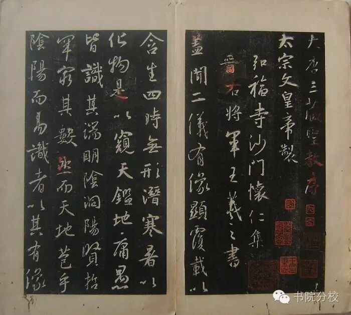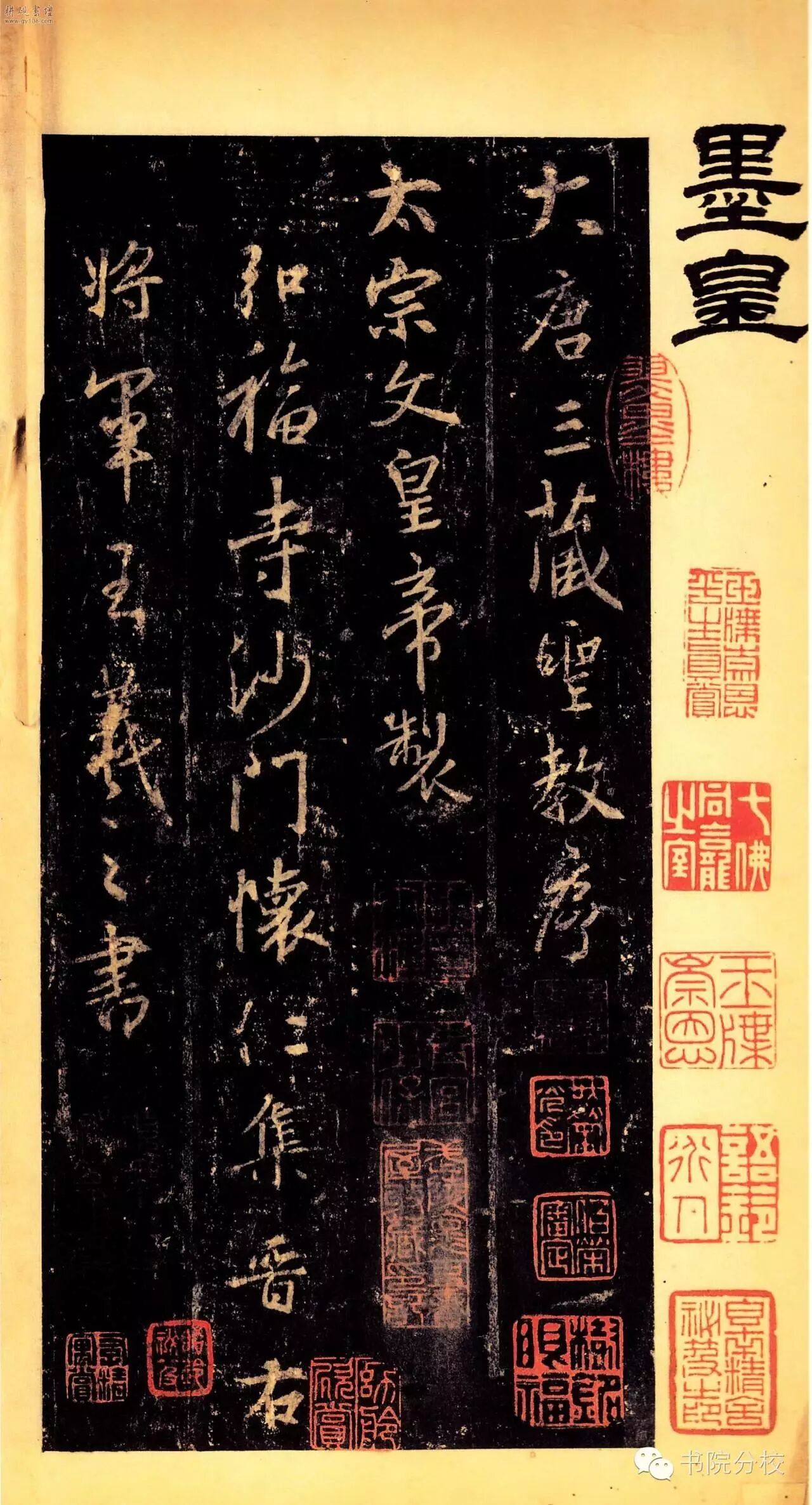 《大唐三藏圣教序》,简称《圣教序》,由唐太宗撰写。最早由唐初四大书法家之一的褚遂良所书,称为《雁塔圣教序》,后由沙门怀仁从王羲之书法中集字,刻制成碑文,称《唐集右军圣教序并记》,或《怀仁集王羲之书圣教序》,因碑首横刻有七尊佛像,又名《七佛圣教序》。集王圣教序碑刻立于唐咸亨三年(六七二),碑通高三五零、宽一零八、厚二十八厘米。碑文三十行,行八十三至八十八字不等。