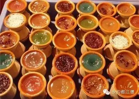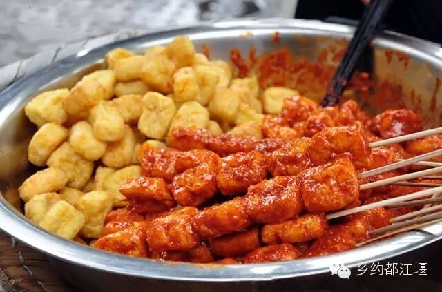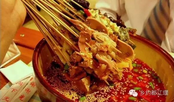 荤素菜品全部用竹签穿成串,再用特制的汤汁浸泡着,随吃随取,现在都江堰比较流行的一种串串吃饭,在吃的时候不用自己烫,选好菜品后,将菜品给老板他们在统一的烫料锅烫好以后,放在烫料钵钵里端上桌,这样吃起来又省劲,不会吃得全身的火锅味儿,0.3元一串。![]()