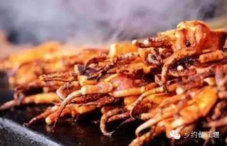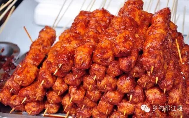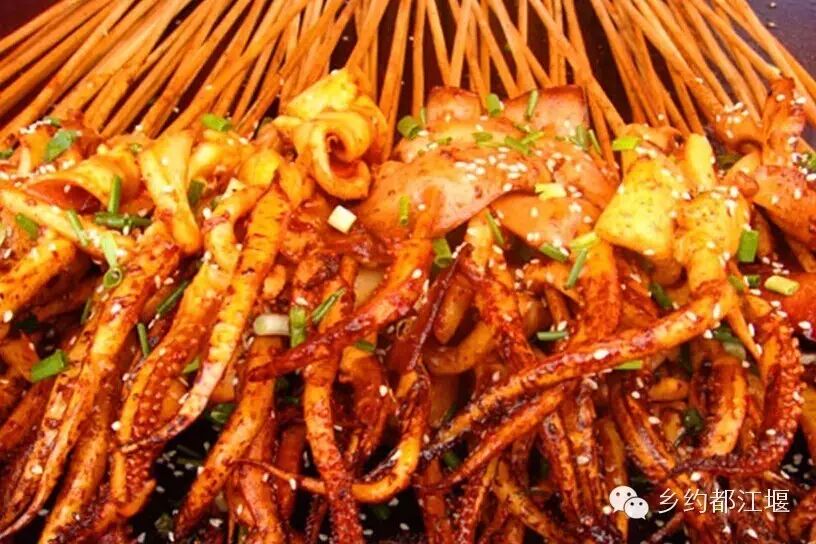 烤鱿鱼是常见的一道美食,都江堰大街小巷处处都有。竹签串好的鱿鱼串,吃起来很鲜嫩,有点脆,加上各种调料的香味,味道脆嫩爽口,香辣鲜美,红亮诱人,回味无穷,3元一串。