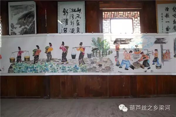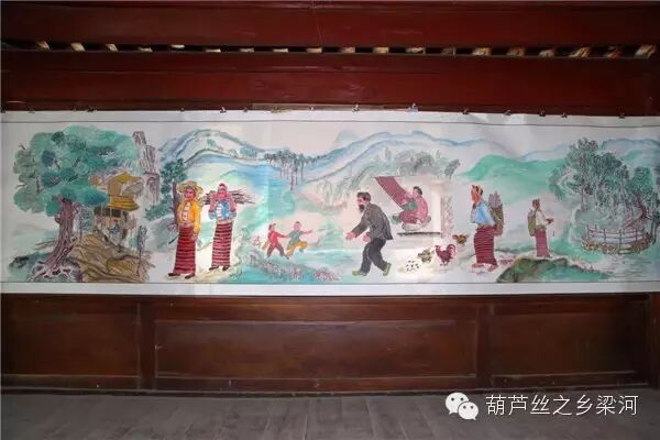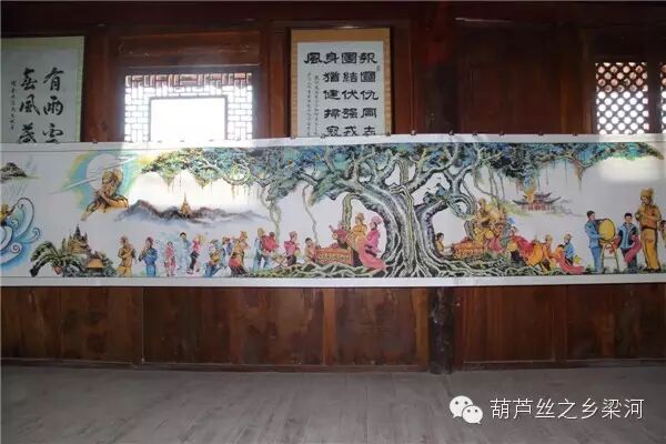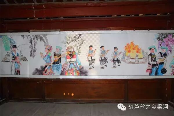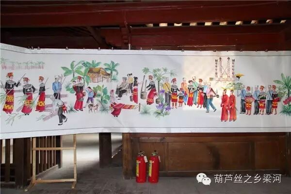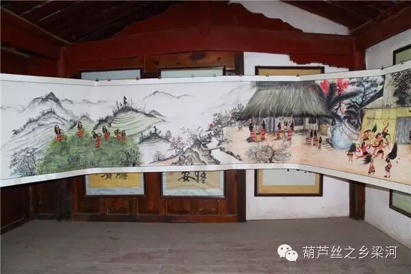 梁河是中国葫芦丝之乡,有着优美的自然风光和厚重的历史文化,17万各族人民向往自由、热爱生活,用勤劳的双手创造了来之不易的幸福生活和多彩多姿的民族风情。为了展现梁河画卷般的山水田园风光和各族人民如歌般的幸福生活,梁河县文联组织姚昌俊、宾元寿、李开仕、尹正雄、林永忠、尹爱华、岳元江7名梁河本土书画家,经查阅大量图文资料,并深入民族村寨体验采风,历时数月,成功创作完成了葫芦丝之乡画卷。画卷长50米,宽1.2米,以梁河县傣、景颇、阿昌、傈僳、德昂、佤6种世居少数民族为创作主体,通过“源于生活又高于生活”的艺术表现手法,形象、生动、细致地描绘了梁河各族群众采茶、舂米、纺织、打铁等真实的生产生活场景和泼水节、目瑙纵歌节、阿露窝罗节等传统民族节日盛况,歌颂了南甸人民悠久灿烂的民族文化和人文风情。