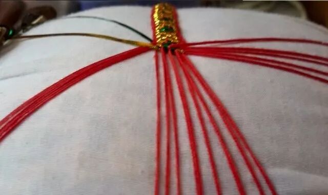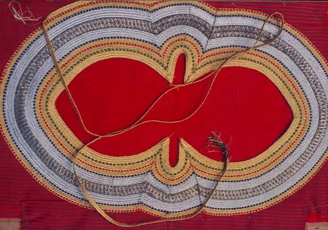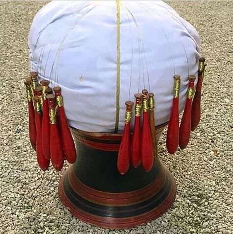球形编织器是马尔代夫传统编织工艺的必备工具,其底部为传统漆器,上托一个球形棉布包,左右两边分别垂挂着4-10个线坠,通过复杂的编织工艺后可制成卡萨布条带Kasabu viyun用于衣领装饰。