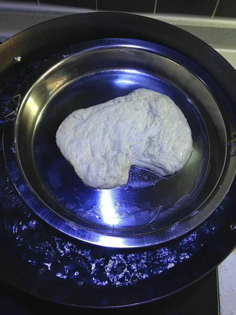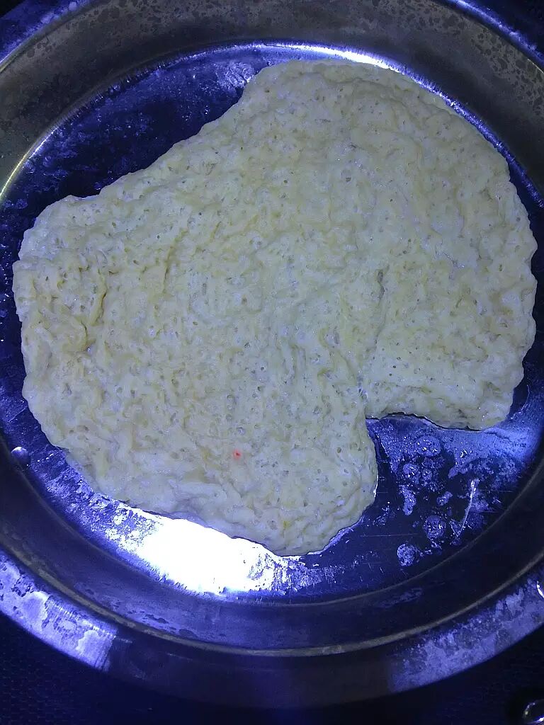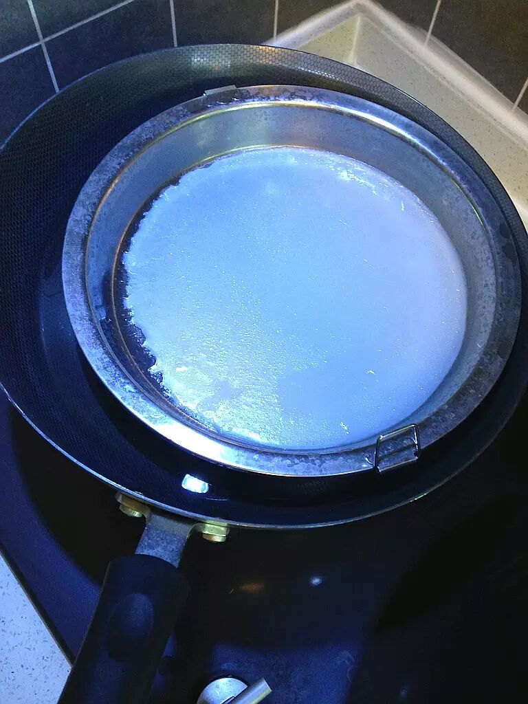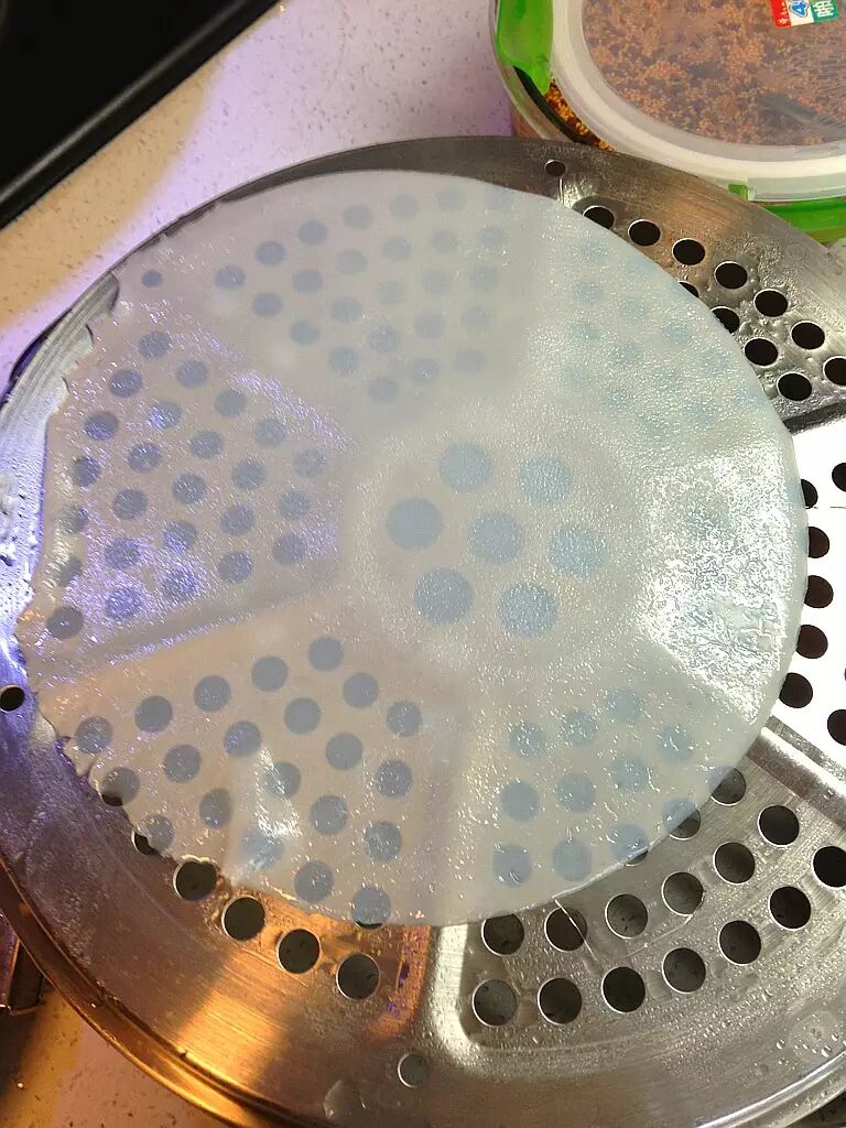 看炒菜锅里水烧开了,立即把锣锣轻柔地放在水面上,盖上锅盖开始蒸。大约3分钟就蒸好一张,期间千万不能揭开锅盖!一揭开锅盖凉皮会断裂。最好你用那种透明的锅盖,如果看到凉皮在锣锣里面鼓起了大泡,就说明好了,可以揭开盖拿出来。