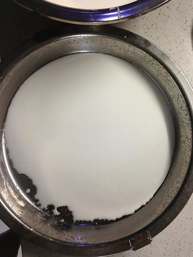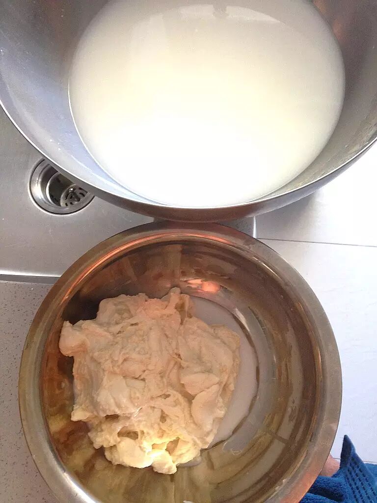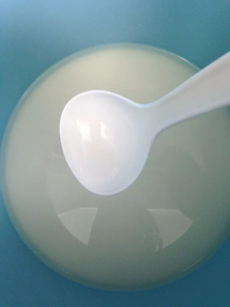 如果你发现刚才白花花的面浆水现在表层呈现出了黄呼呼的半清水状态,这就是面浆沉淀好了(如果你用的是透明的塑料容器,更方便,直接看侧面,清水和面浆有明显的分界线)这时,你需要拿一把勺,用尽你全身最温柔的方式,轻轻的、一勺一勺的、把面浆上的清水滤出来。