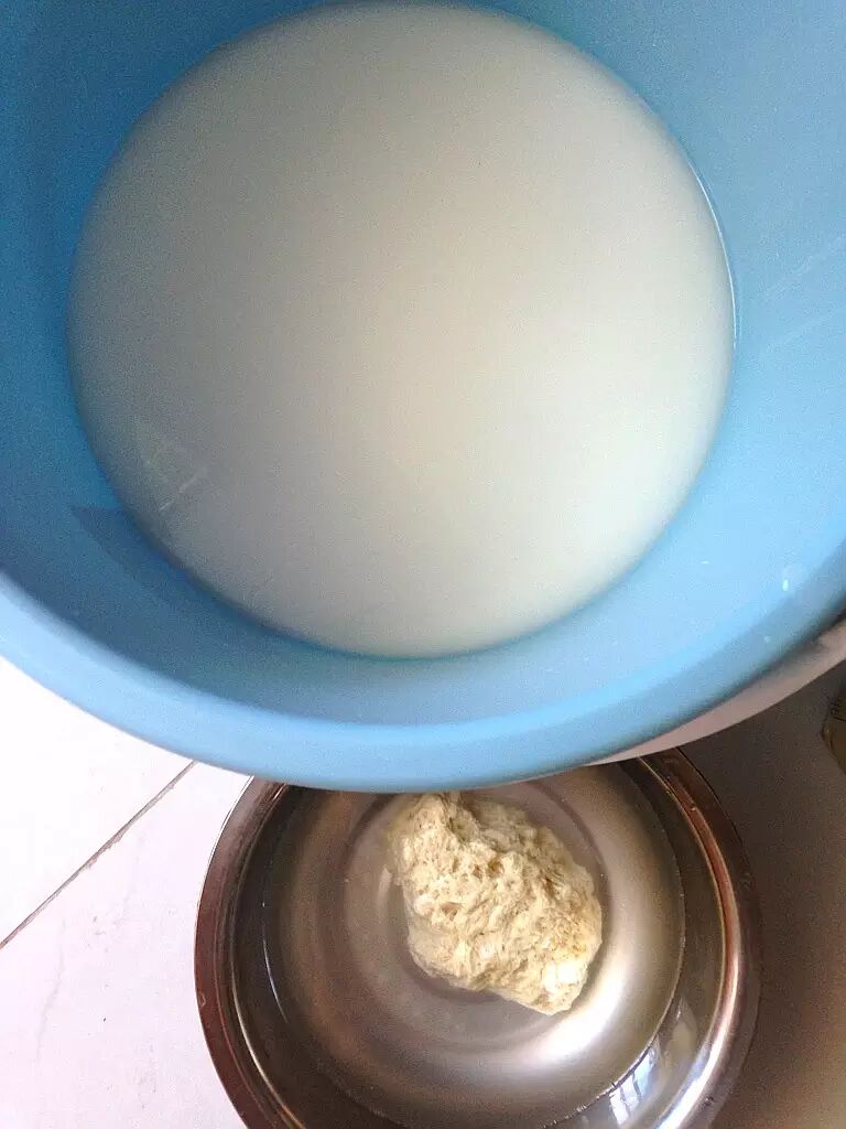 从揉面到洗面,忙碌了1个小时,你可以歇歇了,因为你洗出来的那桶白花花的面粉水,通常需要5-6个小时的静置,才会彻底分离出清水,留下上锅蒸凉皮的凉皮浆。