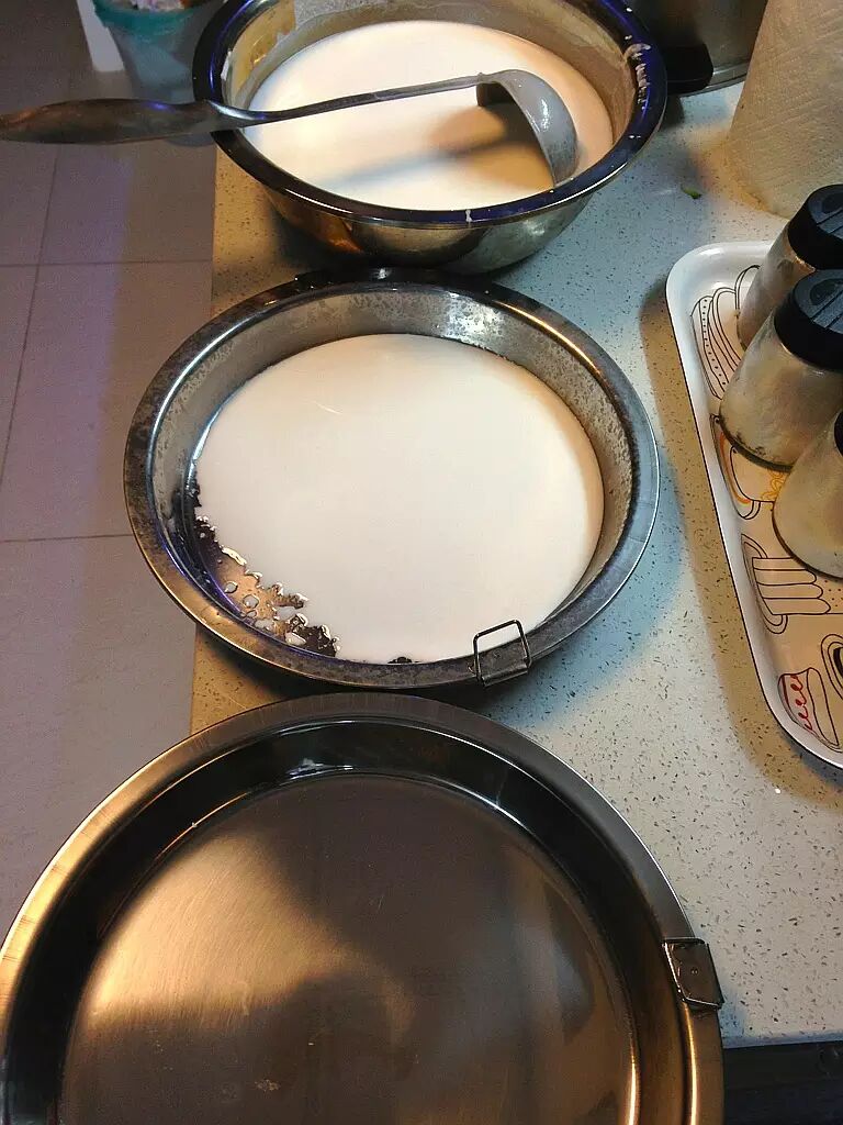 蒸锅旁边要放上一盆凉水,蒸好的凉皮拿起来,连锣锣一起立即放进凉水里,方便剥落。为什么你需要两个锣锣呢?因为当锅中蒸着凉皮时,你可以把另一个锣锣刷好油,放上凉皮浆stand by,等锅里那张蒸好以后,你拿起来,立即可以把预备好的另一个锣锣放进蒸锅里,同时你可以开始揭蒸好的凉皮,刷油,继续stand by蒸下一张。