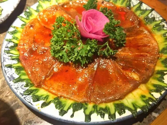 听说吃了之后真的会眉飞色舞!!牛舌被片的薄薄的,码上秘制酱料,油亮的你食指大动!