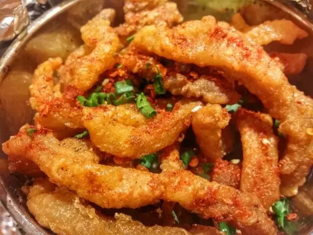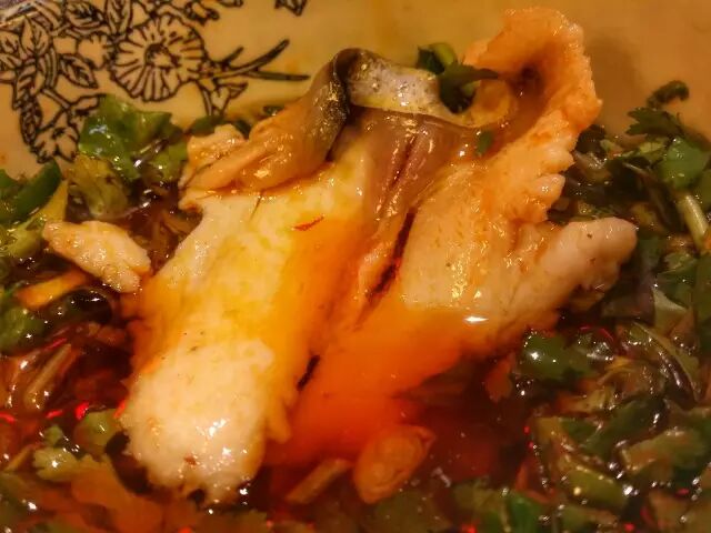小鲜肉原来是现炸的酥肉,撒上辣椒面和葱花包在锡箔纸里面让酒精燃烧,把辣椒的香辣和葱花的清香渗透到酥肉里头~半肥瘦的酥肉口感棒棒哒!!