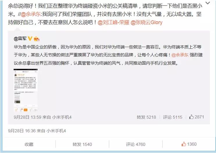 2014年9月28日,广大网友津津有味地“围观”了小米与华为的微博“吵架”。网友表示,雷军和余承东两位“大佬”都蛮拼的。