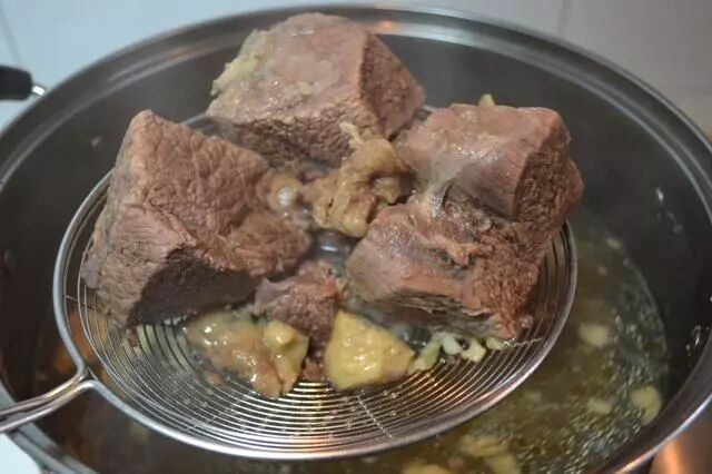 3.牛骨放入砂锅,注入清水大火煮开,撇去浮沫后转小火炖一小时,然后将牛肉和大料放入炖2小时。在第90分钟时放入适量盐,肉煮好后拿出晾凉待用。