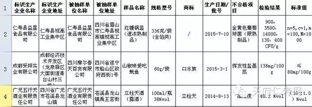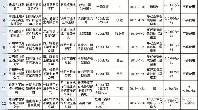 数据显示,本次抽检粮食及粮食制品128批次,不合格样品1批次,为仁寿县益星食品有限公司生产的红糖锅盔金黄色葡萄球菌超标;水产及水产制品9批次,不合格1批次,成都采阳实业有限公司生产的山椒味爱吃鱿鱼挥发性盐基氮超标;蛋及蛋制品17批次、蔬菜及其制品61批次、水果及其制品12批次、食糖3批次、茶叶及其相关制品21批次、糖果及可可制品8批次、豆类及其制品72批次、蜂产品7批次、冷冻饮品3批次、罐头8批次、乳制品20批次、餐饮食品13批次,均全部合格。而属于本次抽检不合格重灾区的是川酒,共159批次,不合格9批次,四川泸州名窖酒业有限公司生产的氿城牌贵宾酒、江油市诗乡蜀宴酒厂生产的金罐罐酒等6批次产品不合格原因为“检出不得使用的食品添加剂环己基氨基磺酸钠(甜蜜素)”。