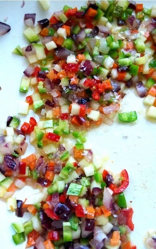 辅料:洋葱10g、胡萝卜8g、青红椒10g、西葫芦10g、植物油10g、葱花少许、黑胡椒粉2g、孜然粉8g、盐2g、蒜蓉辣酱适量、鸡粉少许