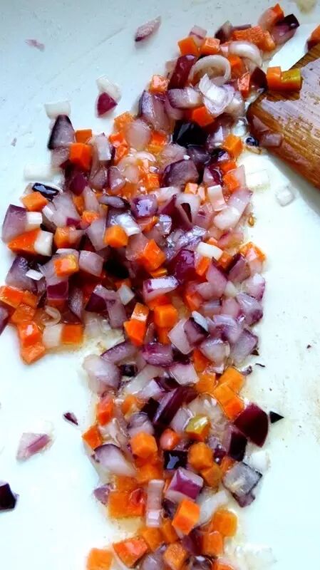 2、热锅热油,爆香葱花和洋葱,加胡萝卜翻炒。