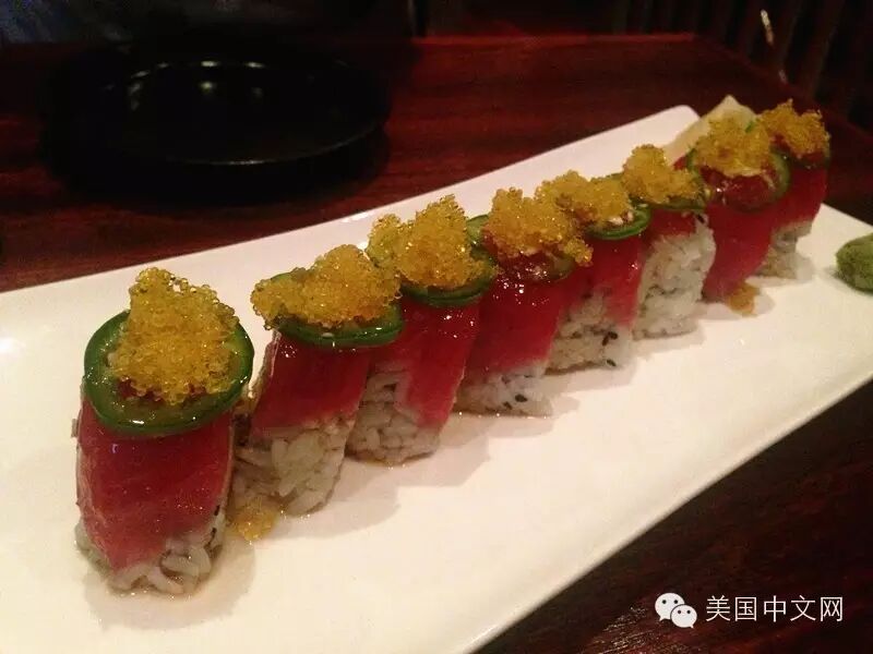 寿司里面的酥脆、鱼肉软嫩,在加上辣椒的刺激,这款寿司的口感颠覆了吃货的想象。一口下去,真是有些冒火的感觉,但还越吃越过瘾。这种搭配倒是很新奇,而味觉冲突感较强,挺有趣。