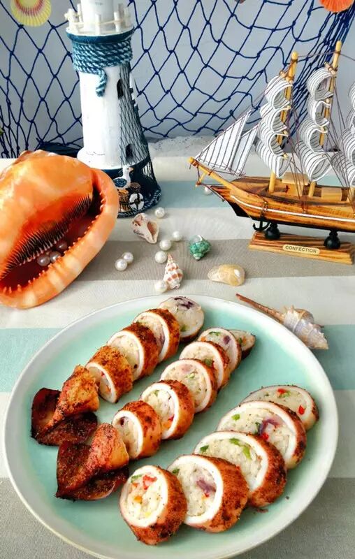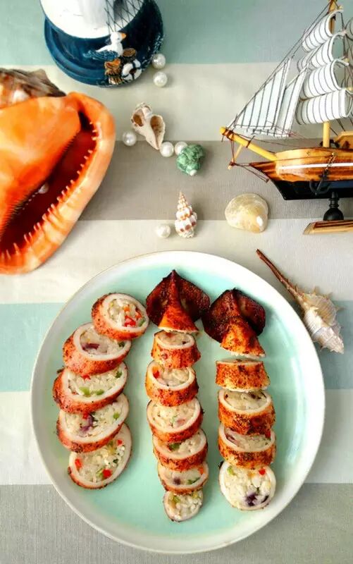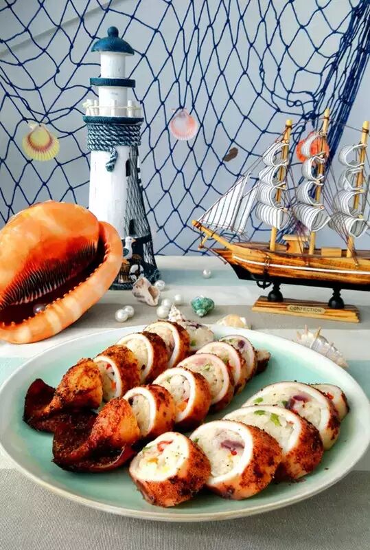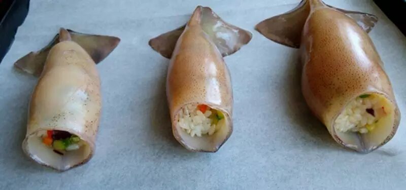5、将炒好的米饭塞入鱿鱼筒中。塞得稍紧一些,开口处留少许空间。鱿鱼熟后会收缩,把筒内的米饭向外挤的。