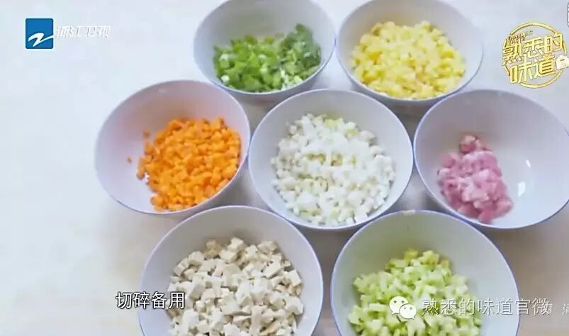 把提前准备好的各种蔬菜丁一次性倒入锅中,