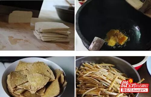 老豆腐切片,入锅油炸,再切成细丝,这也是臊子面里不可或缺的辅料之一。