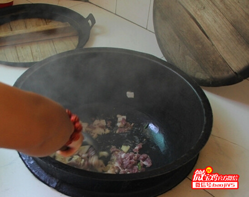 热锅凉油,下生姜、干辣角、花椒与花椒叶煸炒出香味,入肉块翻炒,要把肉里的水份炒干,油脂炒出来,此过程需要些耐心和臂力,所用调料一定要有西府的干辣椒面和香醋。