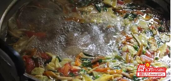 转瞬间,五彩缤纷的食材便在锅里滚开了花,这样的臊子面汤所带来的诱感真让人难以抵御。