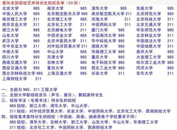 按照新通知,53所高校的艺术特长生仍然可以招生,但“艺术特长生”的叫法不再,变成了53所高校的高水平艺术团招收特长生。