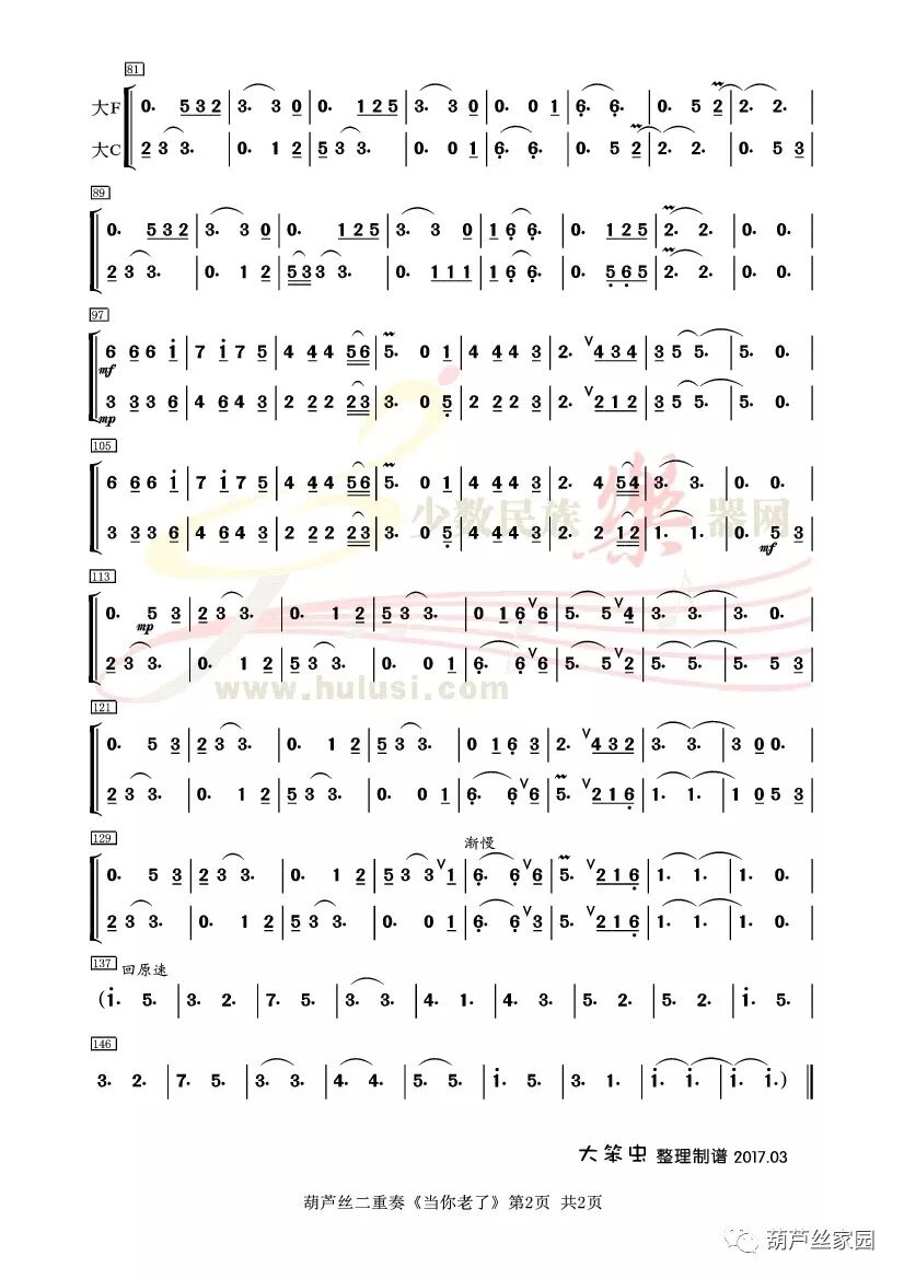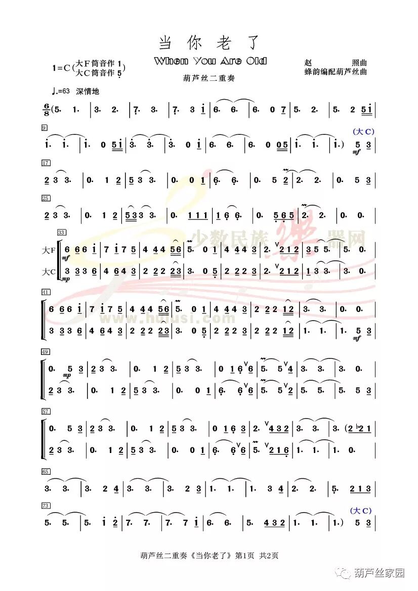 当你老了,头白了,睡意昏沉,炉火旁打盹,请取下这部诗歌,慢慢读,回想你过去眼神的柔和,回想它们昔日浓重的阴影。葫芦丝《当你老了》二重奏 音频