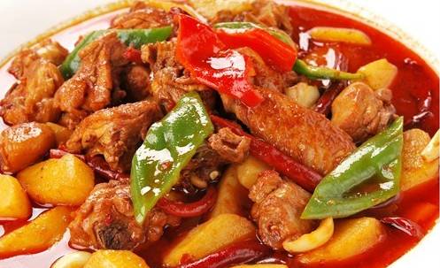 新疆大盘鸡色彩鲜艳,有爽滑麻辣的鸡肉和软糯甜润的土豆,辣中有香,粗中带细。