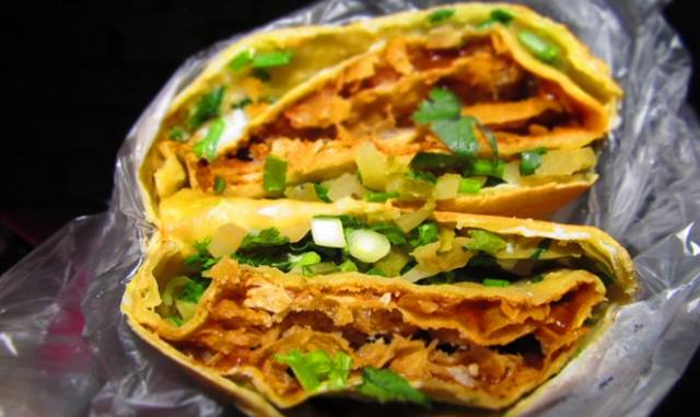 山东煎饼非常薄,以五谷杂粮为原料制成,卷上大葱,蔬菜肉类或山珍海味,可以吃得津津有味。