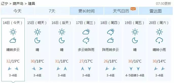 送清凉的北风一直到下周都不会离开辽宁,所以那种“蒸熟感”的闷热天气,将不再继续。未来五天,虽是以晴天和多云为主,但却一天比一天凉快。辽宁大部分地区从下周开始普遍降温,局部地区降幅达6℃-7℃,最高温将跌破30℃,比如沈阳每天都会下降1℃,到了下周四沈阳当天的最高温度只有27℃,而朝阳、阜新等地气温则将陡降7℃。
