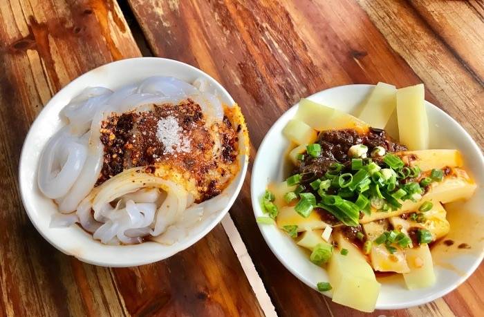 黄凉粉是当家花旦,佐料是用店家秘制豆瓣酱调制的。蘸着这豆瓣酱尝一口,鲜香立刻溢满味蕾。白凉粉则是长条形状,是以豌豆为原料做成,味道更为甜辣些。
