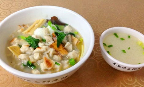 三鲜煮馍:里面配料非常丰富,有响皮、丸子、五花肉、木耳等,馍煮好后,往上面盖上一层现炒的莲菜肉片,在西安有吃家把这东西叫做“猴戴帽”。