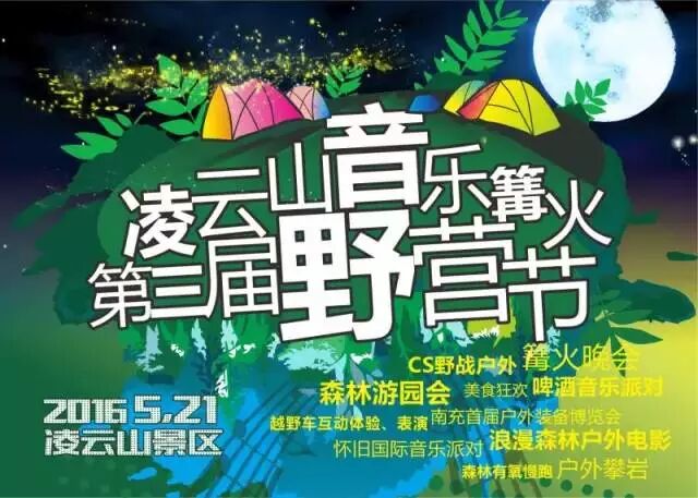 5月21-22日,南充零距离第三届野营节开始报名了,仅需100元门票,就可以享受: 80元可现场兑换美食、啤酒的美食券;凌云山门票58元;凌云山观光车10元;CS野战50元;攀岩50元;篝火晚会800元;怀旧音乐会;森林游园会;凌云山有氧跑;精品环线徒步;美食沙龙;户外啤酒狂欢;定向越野....心动快来报名吧!