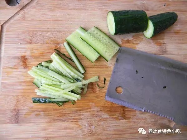 4、黄瓜切微粗的丝;![]()