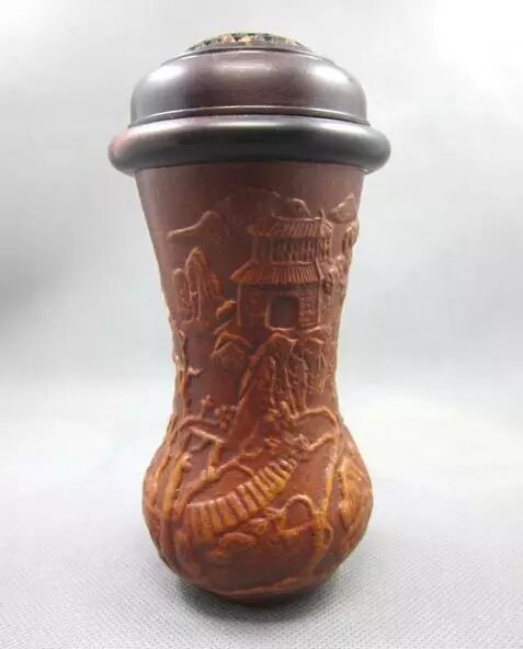 此款葫芦脖颈欣长,色泽红润,老红木口盖。通身饰以山水图案,从纹饰看,线条流畅,布局合理各色景物错落有致。玳瑁蒙芯处音空开设十分考究,对鸣虫发音应具帮助。此器不止养虫,即便作一陈设器。