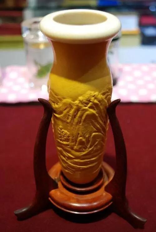 此款葫芦,范模精细,山水错落有致,留白也恰到好处。罐身颈部微收,底部微削,造型上是典型的棒子式葫芦,洁白的牙口,配上金黄的葫芦底子,色泽搭配非常合理,是很适合蓄养蝈蝈的不可多得的葫芦。亦可作陈设之用。