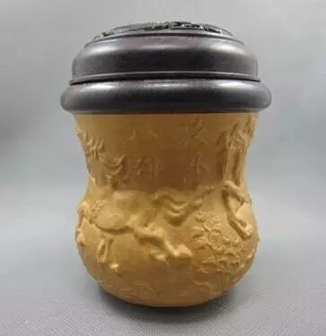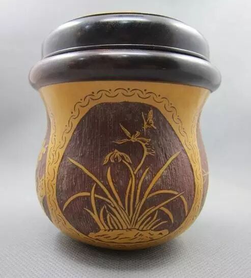 此款葫芦墩,产自山东,取材本长葫芦,色黄自然。老红木包口,玳瑁蒙芯雕刻精美、华贵,皮质密度瓷实,底圆度规矩从审美和实用的角度看都是个中佳品。适合蓄养蟋蟀、油葫芦等虫和把玩。