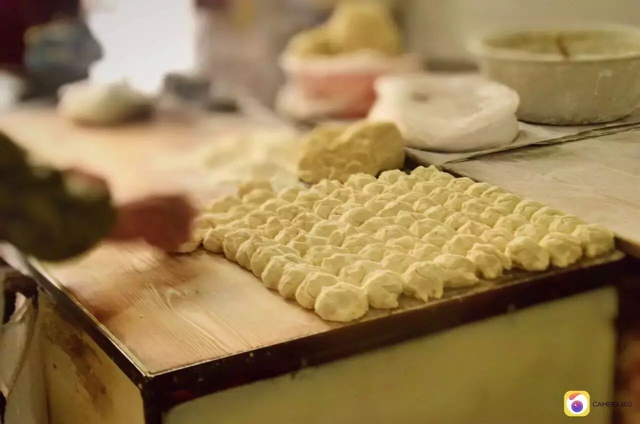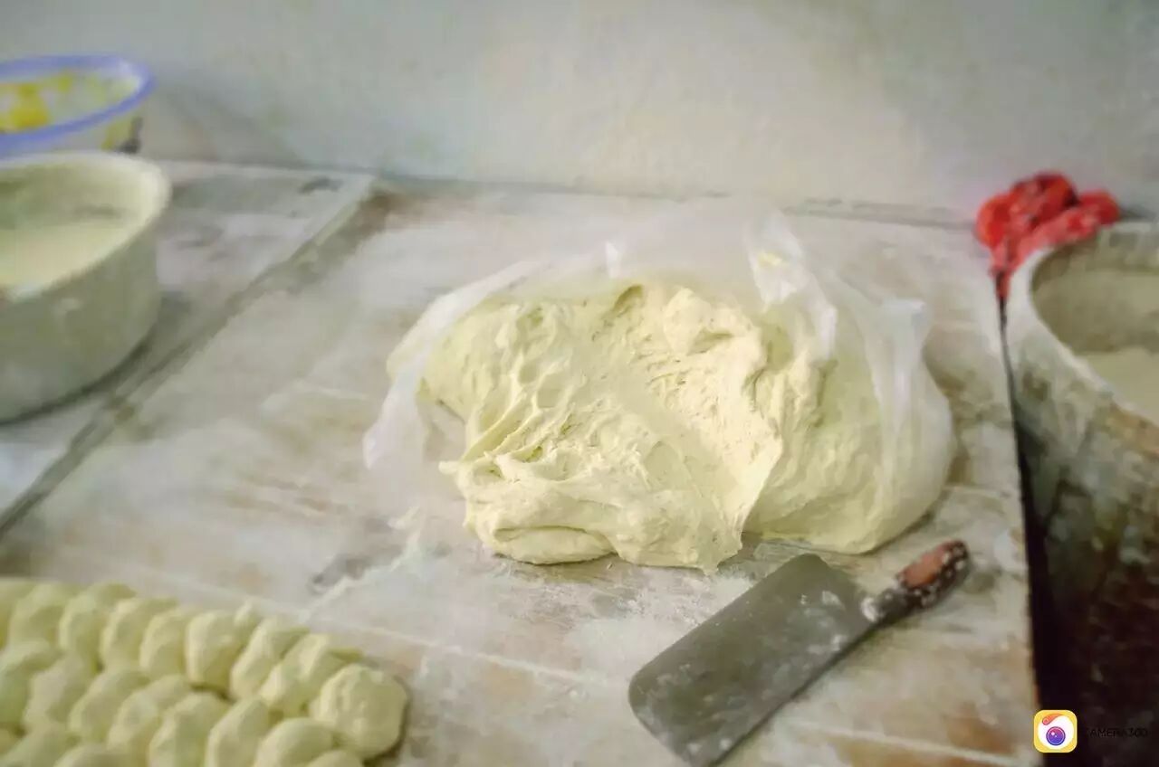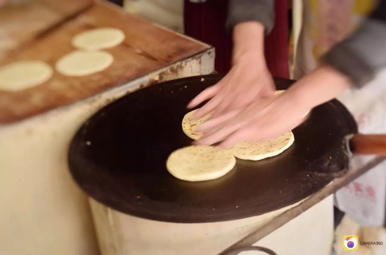 碱水和面,揉入发酵好的面团,加入大量干面,揉面讲究的是劲道。再用坚硬光滑的木头杠子反复揉压,直到将干面团压成绸子一样绵软,然后切成一斤,二斤或三斤不等的面剂子,擀成圆饼,抹上清油,撒上盐、胡椒等佐料,再将面饼卷起来,竖立压成圆形,用木头杠子擀压成厚而大的圆饼,抹上清油,放在超大平底锅上,两手不停翻转快速翻煎,至金黄就可以上炉烘烤了。