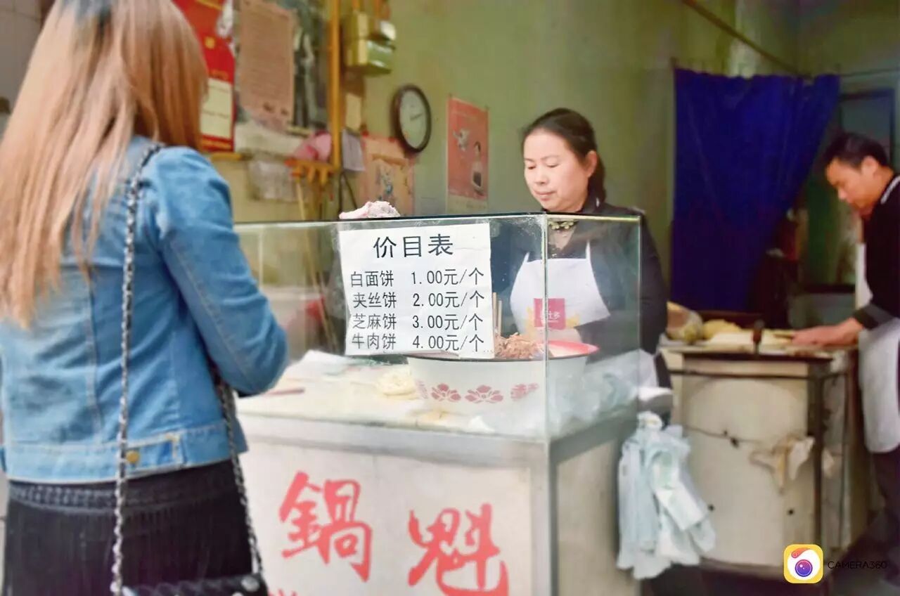 牛肉馅锅盔的肉馅每次都会用这些屉子现蒸。祝师傅说现蒸的味道好,能保证新鲜,客人也爱吃,所以卖的最快。在一旁的祝大娘,淘洗果菜、招呼顾客、负责装饼收钱。动作娴熟,两人配合默契。