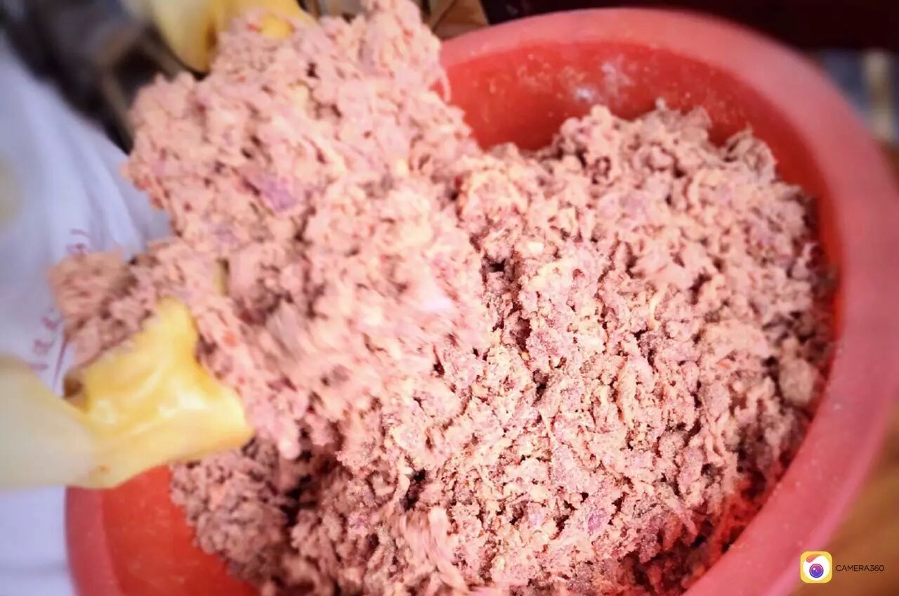 和馅,选择新鲜材料,放入豆瓣、生姜粉、清油、白糖,与事先准备好的肉馅搅拌均匀。祝师傅的锅盔一共三种口味,甜馅(清油),咸馅(萝卜丝),肉馅(牛肉)。其中,牛肉馅的销量是最好的。