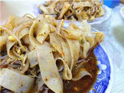 材料:面皮切成细条状,整整齐齐放到袋子里,等到下一波食客到来,老板抓一把面皮放进塑料勺里,夹一筷子黄瓜丝,浇一勺红艳艳的辣椒油,半勺糖一勺醋,拌匀倒进瓷碗里,如果喜欢酸甜口,辣椒就要少放点,这家的辣椒hin辣