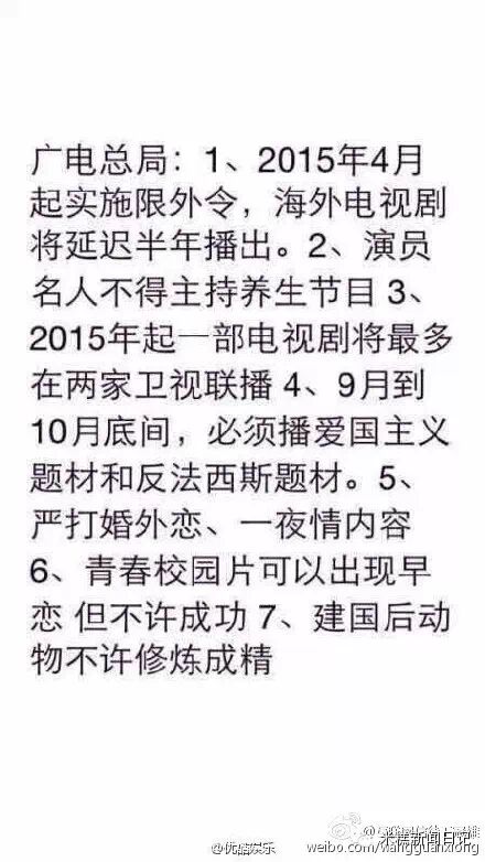 今天,网上疯传一段今年引导电视剧市场的指导意见,看着也是醉了。详见下图