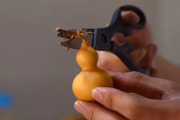 盘葫芦之前要修剪下葫芦的龙头,把不必要的分叉剪短,方便盘完。